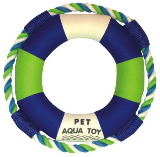 The Pet Life ® 'Life Raver' Rounded Squeaking and Jute Rope Floating Dog Toy features an inner-chew Life-Saver made of Neoprene with a thick outer-banded coordinated Jute Rope that completely floats in water is great for tossing and outdoor water-fetch play.